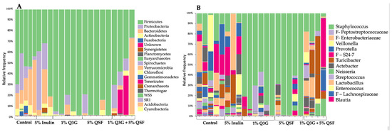 Compositional changes of the cecal microbiota in Gallus gallus following intra-amniotic administration. (A) Bacterial composition analysis at the phylum-level (B) Genus-level visualization of bacterial composition. F—family-level (when genus not known). Q3G, quercetin 3-glucoside; QSF, quinoa soluble fiber.
