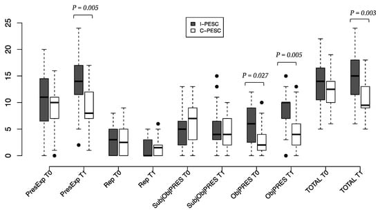 Baseline values (T0) indicate similarities between the I-PESC and C-PESC groups, with the exception of the “Object” subcategory, for which the I-PESC group had a higher frequency of meaning units at T0 (p = 0.027). After the intervention, the frequency of “Present experience” meaning units is higher in the I-PESC group, with an estimated average increase of 3.2 occurrences (p = 0.001), while no changes were observed in the C-PESC group. In the “Object” subcategory, the I-PESC group had an estimated average increase of 2.5 occurrences (p = 0.001), against an average increase of 1.4 occurrences (p = 0.016) in the C-PESC group. Finally, considering the total meaning units, the I-PESC group produced an average of 4.3 (p = 0.003) more meaning units than C-PESC group at T1.