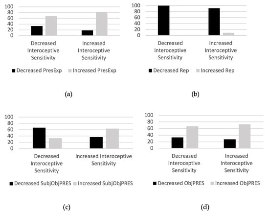Contingency graphics. Participants in the I-PESC group were divided into two subgroups: those who increased their interoceptive sensitivity (T1-T0 > 0) and those who decreased their interoceptive sensitivity (T1-T0 < 0). In each subgroup, it is shown the percentage of participants who: (a) increased or decreased the frequency of meaning units in the “Present experience” category; (b) increased or decreased the frequency of meaning units in the “Repertoire” category; (c) increased or decreased the frequency of meaning units in the “Subject–object relationship” subcategory; and (d) increased or decreased the frequency of meaning units in the “Object” subcategory.
