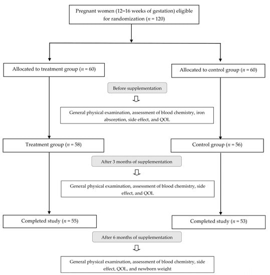 A sample size of 120 was considered as adequately powered, based on discriminating a 10% difference in iron status as the primary endpoint indicator of treatment versus control, with a 10% standard deviation (SD) of effect (α = 0.05 and β − 1 = 0.8) and an anticipated dropout rate of 10%. A total of 324 pregnant women were recruited and screened at the Antenatal Care Clinic of the Health Promotion Hospital, Health Center Region 5, Ratchaburi, Thailand, from October 2018 to June 2019. Exclusion criteria included gestational diabetes mellitus; pre-eclampsia; thalassemia; haemoglobinopathies; chronic diarrhea or other gastrointestinal disorders; treatment with aspirin; and smoking and alcoholism. After screening, a total of 120 pregnant women (20–40 years, 12–16 weeks of gestation) with iron deficiency (serum ferritin < 30 µg/L) were included, with all women giving informed consent and indicating willingness to follow trial procedures prior to enrollment.