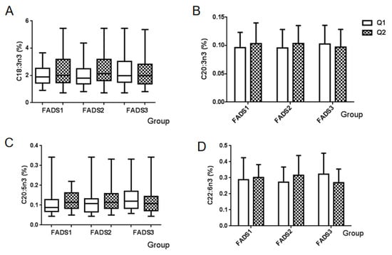 Association between the n-3 PUFA and mRNA expression groups of FADS genes. Values are the proportion of each n-3 PUFA of breast milk among FADS gene expression groups. (A) α-Linolenic acid (C18:3n3), (B) eicosatrienoic acid (C20:3n3), (C) EPA (C20:5n3), and (D) DHA (C22:6n3). Q1: Low mRNA expression group, Q2: High mRNA expression group.