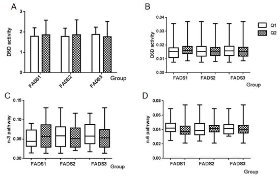 Distributions of enzyme activity and PUFA pathway activity among FADS gene expression groups. (A) D5D activity, (B) D6D activity, (C) n-3 PUFA pathway, and (D) n-6 PUFA pathway. Q1: Low mRNA expression group, Q2: High mRNA expression group.