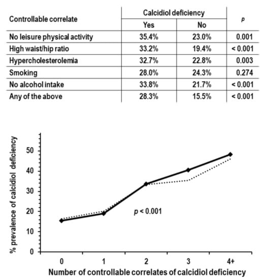 Based on the results of the multi-variable logistic regression, the analyses on the controllable correlates of calcidiol deficiency focused on the following five traits: no leisure physical activity, high waist/hip ratio, hypercholesterolemia, smoking, and no alcohol intake. These five traits were defined as categorical variables (yes/no = 1/0). In the 952 examinees not reporting the use of vitamin D supplements, the prevalence of calcidiol deficiency was higher in the presence of any one of these traits and was linearly higher with increasing the number of traits (Figure 1).