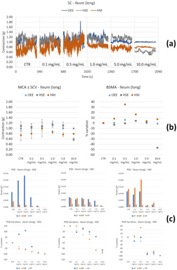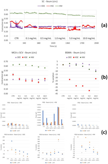 Spontaneous. The LabChart Software (ADinstruments, Bella Vista, NSW, Australia) was used to acquire the tracing graphs of spontaneous contractions of ileum and colon. After the equilibration period (approximately 30 to 45 min according to each tissue), cumulative concentration curves (0.1, 0.5, 1.0, 5.0 and 10.0 mg/mL) of HM, OEE and HSE samples were constructed. Cumulative log-dose–response curves were constructed for Otylonium Bromide (OB), used as a positive control. A 5 min stationary interval of the Spontaneous Contraction (SC) recording was selected at the final stage of each concentration. For each interval, the following parameters were extracted and calculated: the Mean Contraction Amplitude (MCA), evaluated as the mean force value (g); the standard deviations of the force values over the period, as an index of the Spontaneous Contraction Variability (SCV); and Basal Spontaneous Motor Activity (BSMA), as the percentage (%) variation of each mean force value (g) with respect to the control period. The spontaneous contractions were investigated in the frequency domain through a standard FFT analysis and a subsequent Power Spectral Density (PSD) plot. The absolute powers of the following frequency bands of interest—low [0.0,0.2[ Hz (LF), medium [0.2,0.6[ Hz (MF) and high [0.6,1.0] Hz (HF) [5]—were then calculated. The PSD percentage (%) variations for each band of interest with respect to control were estimated.
