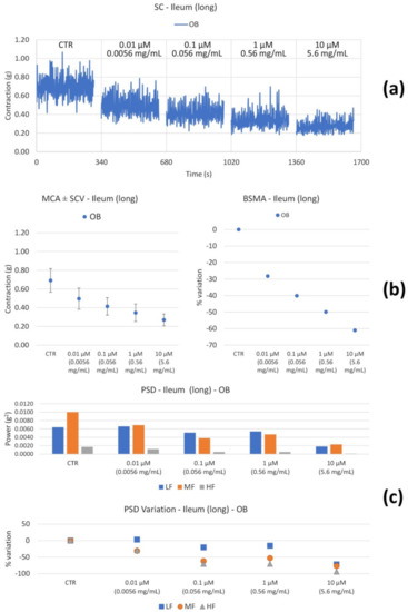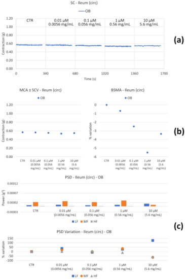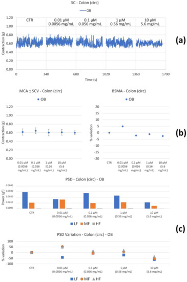 Regarding colon circular smooth muscle, OB does not induce any tone modifications (Figure 9b). Neither MCA nor BSMA undergo any alterations. OB determines a slight decrease in the low and medium frequency contractions (Figure 9c) at the highest concentration tested (10 µM).