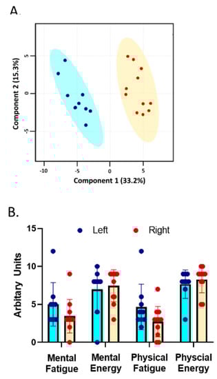 The survey was conducted online using Qualtrics (Qualtrics, XM, Provo, UT, USA). The mental and physical state and trait energy and fatigue scales [] were used to discriminate between mental and physical energy and fatigue. The reliability and temporal stability of these scales has been previously demonstrated [,,,,,,,]. For the current study, reliability was tested using Cronbach’s Alpha test in SPSS (IBM Corp. Released 2020. IBM SPSS Statistics for Windows, Version 27.0. Armonk, NY, USA: IBM Corp). The scores were PE, 0.767, PF, 0.899, ME, 0.890, and MF, 0.893.