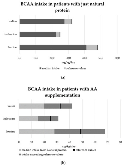 Branched-chain amino acid (BCAA) intakes compared to reference values (mg/kg/day) in a group of patients with just NP intake (a) and in a group of patients with AA supplementation (b).