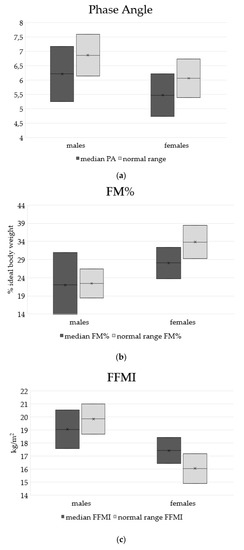 With regard to BIA analysis, the phase angle (PA) was 6.0° ± 0.9° (women: 5.7° ± 0.7°; men: 6.2° ± 0.9°), as reported in Figure 4a with reference values [20].