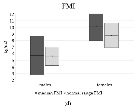 The FM index (FMI) was calculated in relation to height squared: 10 ± 2 kg/m2 in women and 5.7 ± 3 kg/m2 in men (Figure 4c). FM% and FMI were, on average, higher than normal reference values [19], especially in the group of patients with AA supplementation (FM% = 27 ± 10).