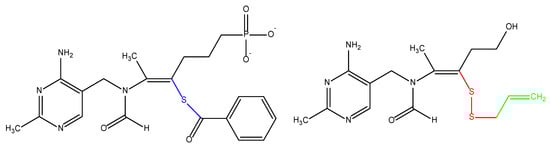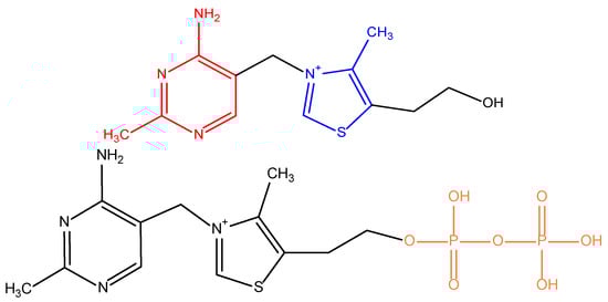In 1897, vitamin B1 was discovered as the first vitamin, at that time called “vitamine”. It was isolated in 1926 and synthesized 10 years later. This substance contains an amino group, and, because of that, it was called “vital amine“ (“an amine of life“), which, as mentioned, initially gave the name to the whole group of micronutrients—formerly vitamines, currently known as vitamins [1]. Vitamin B1 was also formerly known as “aneurin“ because it prevented neurological symptoms of hypovitaminosis. Currently, rather, it is known as thiamine. This term reflects the presence of both sulfur and an amino group in the molecule. Thiamine is a water-soluble compound composed of pyrimidine (or precisely 4-amino-2-methylpyrimidine) and thiazole/4-methyl-5-(2-hydroxyethyl)-thiazolium/rings, which are linked by a methylene bridge (Figure 1) [2,3,4,5].