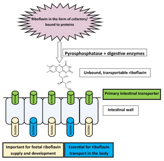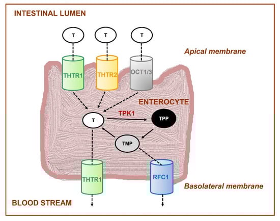 Free thiamine is taken up into intestinal mucosal cells (enterocytes), mainly by two saturable and high affinity transporters, THTR1 (encoded by SLC19A2 gene) and THTR2 (encoded by SLC19A3 gene) (Figure 2). THTR1 transporter is located on the apical brush-border membrane and basolateral membrane, while THTR2 is found only on the apical surface [194,195,196,197]. Moreover, other transporters (e.g., organic cation-transporters OCT1,3), which are not specific to thiamine, are involved in this process, as well [198].