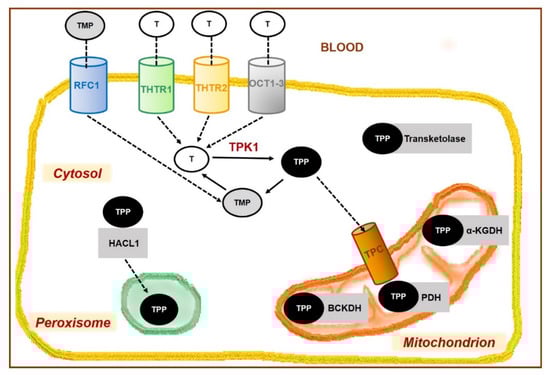 From blood, thiamine is taken up into cells of various tissues by previously mentioned transporters, i.e., THTR1, THTR2, and OCT, while RFC1 allows TMP transfer again (Figure 3). Both carriers THTR1 and THTR2 are highly expressed in the cells of various organs, e.g., skeletal muscle, heart, kidney, liver, pancreas, brain, placenta, and adipose tissue [5,200].