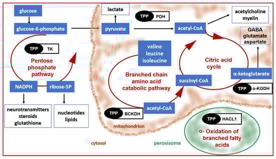 In the cytosol, TPP-dependent transketolase is involved in the pentose phosphate pathway, that utilizes glucose and produces ribose-5-phosphate and nicotinamide adenine dinucleotide phosphate (NADPH), important for nucleotide, lipid, and neurotransmitter synthesis, as well as antioxidant defense [209]. Another TPP-dependent enzyme 2-hydroxyacyl-CoA lyase 1 (HACL1) is located in the peroxisomes. This enzyme is essential for α-oxidation of branched fatty acids [210].