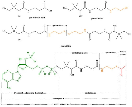 - Nelson, R.A. Intestinal transport, coenzyme A, and colitis in pantothenic acid deficiency. Am. J. Clin. Nutr. 1968, 21, 495–501. [Google Scholar] [CrossRef]