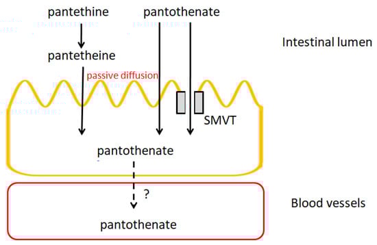 - Shibata, K.; Gross, C.J.; Henderson, L.M. Hydrolysis and absorption of pantothenate and its coenzymes in the rat small intestine. J. Nutr. 1983, 113, 2107–2115. [Google Scholar] [CrossRef] [PubMed]