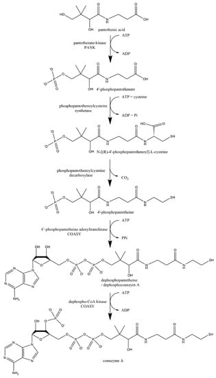 - Naquet, P.; Kerr, E.W.; Vickers, S.D.; Leonardi, R. Regulation of coenzyme A levels by degradation: The “Ins and Outs”. Prog. Lipid Res. 2020, 78, 101028. [Google Scholar] [CrossRef]