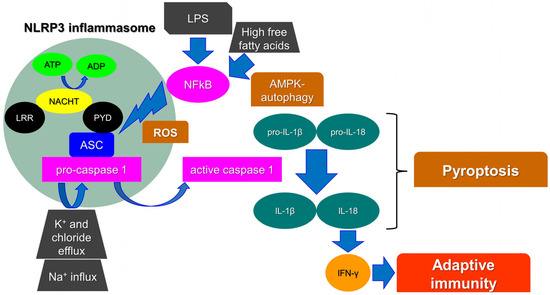High levels of glucose and non-esterified fatty acids (NEFAs) can cause oxidative stress due to both the decoupling of oxidative phosphorylation and to the increased mitochondrial β-oxidation. Lee et al. found that hyperglycemia-induced elevated mitochondrial reactive oxygen species in myeloid cells of T2D patients are associated with increased production of inflammasome-dependent cytokines IL-1β and IL-18 [50]. Some data also showed that inhibition of AMP-activated protein kinase can exacerbate ROS-dependent NLRP3 activation [50]. It was recently pointed out that NLRP3 might directly sense the presence of increased ROS production (mitochondrial superoxide anion radical (O2•−), hydrogen peroxide (H2O2)) by normal or malfunctioning mitochondria, or indirectly by other activators of NLRP3. In particular, it was suggested that increased ROS are sensed by a complex of redox-dependent inhibition of thioredoxin (TRX) and TRX-interacting protein (TXNIP) and cause the dissociation of the complex described above. Following an increase in cellular ROS concentration, this complex dissociates and TXNIP binds to the LRR region of NLRP3, with the consequent NLRP3 activation [51].