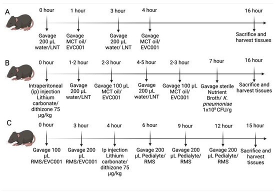 Model schematic. (A) Timeline for dosing optimization trials with Lacto-N-Tetraose (LNT) and EVC001. (B) Timeline for the Paneth cell disruption with bacterial dysbiosis NEC model as well as the incorporation of the dosing scheme for LNT and EVC001. (C) Timeline for the RMS NEC model with the incorporation of EVC001 dosing. RMS, Rodent Milk Substitute.
