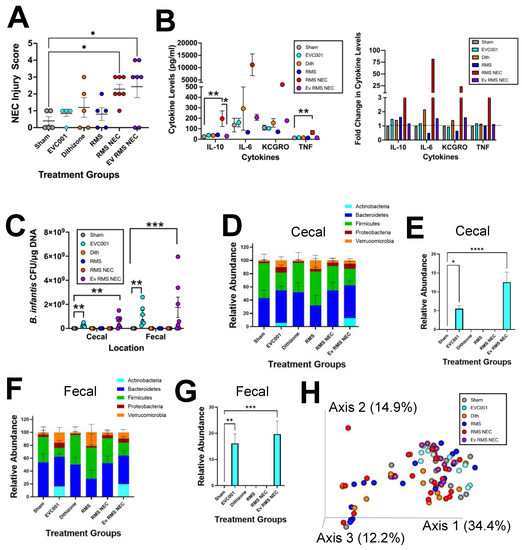 One drawback of utilizing the Paneth cell disruption model of NEC is that it is dependent on K. pneumoniae gavage to induce dysbiosis. This may confound probiotic studies through bacterial interactions. To compensate for this, we also utilized a complimentary RMS formula NEC model, which induces NEC through dithizone-induced disruption of Paneth cells and RMS formula feeding [40]. An additional advantage of this model is that it exhibits higher serum cytokine levels compared to the standard Paneth cell disruption with bacterial dysbiosis NEC model [40]. While EVC001 significantly improved NEC injury in the Paneth cell disruption with the bacterial dysbiosis model, EVC001 did not impact injury in the RMS model (Figure 4A). RMS formula NEC mice and RMS formula NEC mice receiving EVC001 (Ev RMS NEC) had significantly higher injury scores compared to sham controls (p ≤ 0.0201, 0.0358, respectively) (Figure 4A). Interestingly, when the cytokine levels were analyzed, RMS formula NEC mice had significantly higher levels of IL-10 compared to sham (p ≤ 0.0017), which was mitigated by gavage of EVC001 in the Ev RMS NEC group (p ≤ 0.0228) (Figure 4B). Similarly, for TNF-α, RMS formula NEC mice had significantly elevated levels compared to sham (p ≤ 0.0075) (Figure 4B). Although Ev RMS NEC mice had TNF-α levels not significantly different from sham (p > 0.9999), the levels were also not significantly different from RMS NEC (p = 0.2411). Furthermore, although not significantly different, it was notable that levels of IL-6 and KC-GRO had trending decreases in RMS formula NEC mice given gavage of EVC001 compared to their NEC counterparts (Figure 4B). Similarly, to the Paneth cell disruption with bacterial dysbiosis model results, upon examining the total abundance of B. infantis EVC001 via qPCR in the cecum and colonic contents (fecal), it was clear that gavage of B. infantis EVC001 (aqua and purple circles) resulted in elevated levels of EVC001 DNA detected, while groups not receiving B. infantis EVC001 (gray, orange, blue, and red circles) did not display this trend (Figure 3B and Figure 4C). In addition, similar to the results from the Paneth cell disruption with bacterial dysbiosis model, mice that received EVC001 had significantly increased B. infantis EVC001 DNA present in the cecal and fecal compartments compared to sham (p ≤ 0.0073 and p ≤ 0.0025 respectively) (Figure 3B and Figure 4C). RMS formula NEC mice that received B. infantis EVC001 also had significantly higher amounts of B. infantis DNA compared to sham controls in both the cecal and fecal compartments (p ≤ 0.0009 and p ≤ 0.0017, respectively) (Figure 3B and Figure 4C). When looking at the microbiome of these mice, there were no significant differences in any phyla between NEC and NEC+EVC001 treatments (Figure 4D,F). In contrast to observations in the Paneth cell disruption with bacterial dysbiosis NEC model, the RMS formula NEC model did not have a high relative abundance of Proteobacteria in any group (Figure 4D,F). Additionally, mice that received EVC001 in the RMS formula NEC model saw significantly larger amounts of Bifidobacteriaceae present in both the cecal and fecal microbiome compared to all other treatment groups (p ≤ 0.0083) and larger relative abundances than what was observed in the Paneth cell disruption with bacterial dysbiosis NEC model (Figure 3F,I and Figure 4E,G). Mice that received EVC001 without NEC induction also had significant increases in Bifidobacteriaceae levels compared to shams in both the cecal and fecal compartment (p ≤ 0.0437). These results carried over into a beta diversity analysis using a weighted UniFrac PCoA, as mice that were given EVC001 either as a control (aqua circles) or in the NEC condition (purple circles) tended to cluster together in the plot although not distinctly from the other groups displayed (Figure 4H).