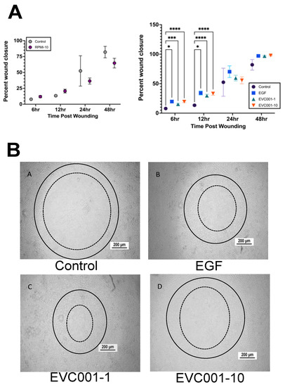 Recent studies have provided support for B. infantis having a benefit in protecting and healing the epithelial barrier of the intestine [10,34,36,52]. To determine whether this could be a potential mechanism for the decrease in injury scores observed in mice receiving EVC001, radial wounds were made in rat intestinal epithelial cell monolayers (IEC-18) 48 h following treatment with EVC001 and wound closure was compared over 48 h to sham controls and wounds treated with EGF (positive control) (Figure 5). RPMI media, which served as the vehicle control for the EVC001 supernatants, did not show any significant difference in wound closure compared to shams at any time point examined (6 h and 12 h p = 0.1339, 24 h p = 0.5753, 48 h p = 0.3520) (Figure 5A). At both the 6- and 12-hour time points after wounding, both concentrations of EVC001 supernatants induced modest but significantly improved wound healing compared to the sham controls (p ≤ 0.0004) (Figure 5). Representative images from the 12-h time point after wounding are shown in Figure 5B, which were generated by making a solid line circle on the 0-h image and putting it onto the 12-h time point image and adding a dashed line indicative of where the wound had healed to at that point (the inner edge of cellular migration and proliferation).