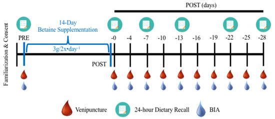 Prior to each participant’s PRE, POST0, POST7, POST13, POST22, and POST28 visits, they were required to record 24 h food recalls via the MyFitnessPal (San Francisco, CA, USA) application, which were subsequently transferred and analyzed for micronutrient intake via Food Processor dietary assessment program (ESHA Research, Salem, OR, USA). Participants were instructed on how to use relevant features if unfamiliar with the modality. Moreover, our board-certified laboratory Registered Dietitian (RD) assessed the logs for any apparent nutrient inadequacies that may impede HCY metabolism (folate, as well as vitamins B2, B6, B12, and choline) [7]. If participants demonstrated an insufficient intake of the aforementioned nutrients based on current American dietary standards, they were provided a B-complex multivitamin (Nature Made Super B Energy Complex Softgels, West Hills, CA, USA; thiamin 1.5 mg, riboflavin 1.7 mg, niacin 20 mg, pyridoxine hydrochloride 2 mg, folic acid 400 mcg, cyanocobalamin 6 mg, biotin 300 mcg, and pantothenic acid 10 mg) in a quantity commensurate to the number of days leading up until their next dietary assessment visit and instructed to take one softgel per day alongside their first daily betaine dose [31]. Diets were reassessed at each 24 h recall visit to determine whether the B-complex would remain necessary until the following assessment. Lastly, it is important to note that participants’ diets were not standardized, but they were asked not to change their dietary habits during the study duration. Dietary macronutrient (protein, carbohydrate, and fat) as well as fiber intake were calculated on all 24 h dietary records. All macronutrient and fiber data were subsequently normalized to weight (kg) of that respective visit for further statistical analyses.