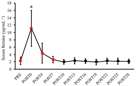 Serum betaine concentrations at baseline and during a 28 day washout period. All data are reported as the means ± SD and performed at a significance level of p < 0.05. * Significant time effect, whereby follow-up analyses (data points analyzed are depicted as red circles) determined a significantly elevated serum betaine at POST0 relative to PRE. Furthermore, neither POST4 nor POST7 concentrations were statistically different from baseline.