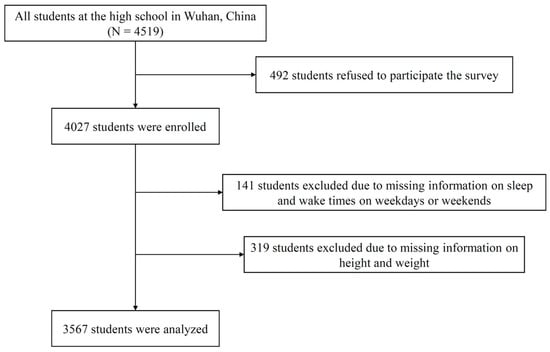This school-based cross-sectional study was conducted in October 2019 among adolescents in a large high school in Wuhan, China. A total of 4519 adolescents at the high school were invited to participate in this study, and 89.11% of them consented to participate. Owing to the incomplete answers to the questionnaire (N = 460), the final analytic sample was composed of 3567 subjects (Figure 1).