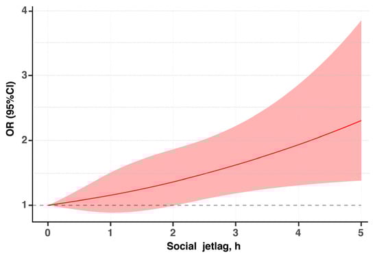 Association of social jetlag and overweight or obesity among Chinese adolescents. The solid lines indicate multivariate-adjusted odds ratios and the shaded areas indicate the 95% CIs. The reference point is 0 h for social jetlag, with knots located at the 10th, 50th, and 90th percentiles. The regression was adjusted for cofounders in Table 4.