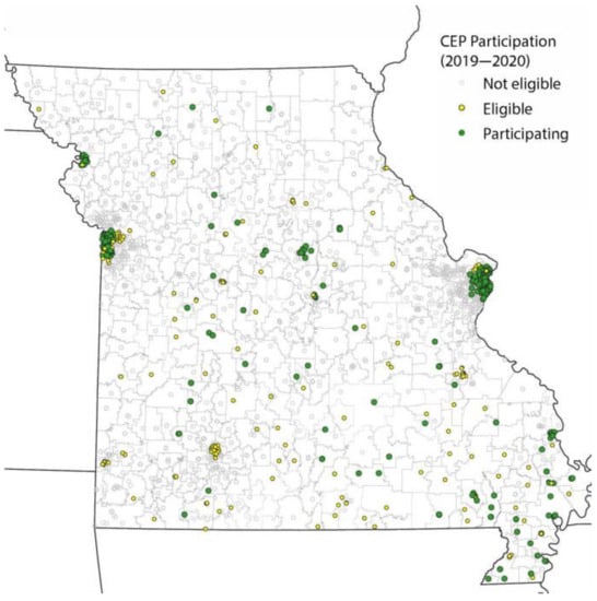 - Gross, S.M.; Kelley, T.L.; Augustyn, M.; Wilson, M.J.; Bassarab, K.; Palmer, A. Household Food Security Status of Families with Children Attending Schools That Participate in the Community Eligibility Provision (CEP) and Those with Children Attending Schools That Are CEP-Eligible, but Not Participating. J. Hunger Environ. Nutr. 2021, 16, 281–296. [Google Scholar] [CrossRef]