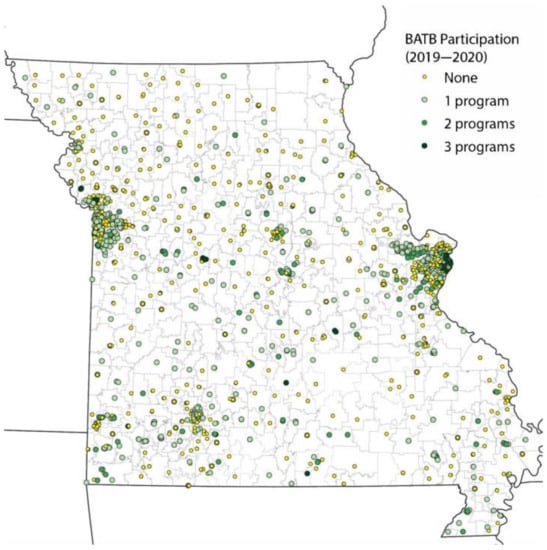 Similarly, BATB participation was highly concentrated in urban areas, such as St. Louis City (Figure 2).