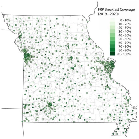 While FRP breakfast did not show strong spatial patterns, it is still notable that schools with high FRP breakfast coverage were concentrated in urban centers (Figure 3).