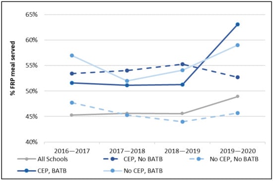 Additionally, while our conditional DiD methods account for geographic differences in food access, one notable recent study of Missouri schools points out that because of the 40% ISP threshold, schools adopting CEP likely already have large percentages of FRP-eligible students, an estimated 79% [47]. Therefore, CEP by itself may have limited impacts on increasing FRP meal participation, which aligns with our descriptive results. Practically, BATB models also can present obstacles for schools and meal service departments, including implementation costs, reliance on additional staff and teachers outside the cafeteria for successful service delivery, and additional communication with parents. Both the administrative and programmatic opportunities and potential challenges for increasing school meal access present significant considerations for schools in Missouri, the U.S., and beyond for increasing student meal participation and nutrition.