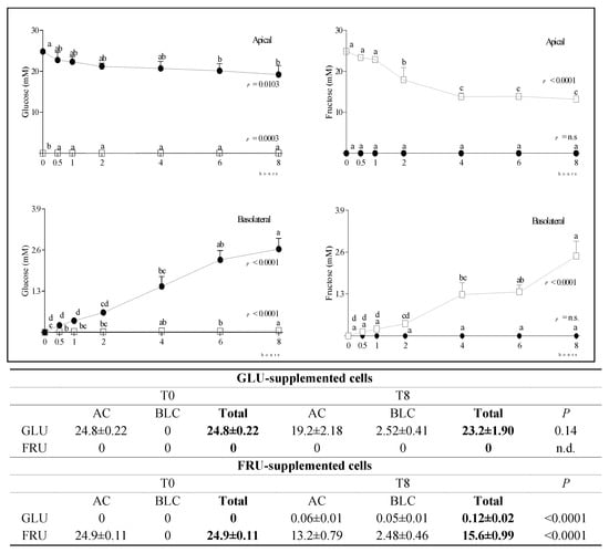 Changes in GLU and FRU concentration in the AC and BLC of GLU- and FRU-supplemented cells. Data are means ± SD of at least 3 samples from independent experiments. In the graphs, GLU (left panel) and FRU (right panel) concentrations (mM) at different time points are indicated by black circles (GLU-supplemented cells) or white squares (FRU-supplemented cells). In each experimental condition, differences between different time points were evaluated by the one-way ANOVA with Tukey’s post hoc test (different letters indicate significant differences). In the table, the total concentration of the monosaccharides at T0 and T8 in the same experimental condition is reported and compared by unpaired t-test. In each condition, statistical analysis was by an unpaired t-test to evaluate differences between T0 and T8. GLU: glucose; FRU: fructose; AC: apical chamber; BLC: basolateral chamber.