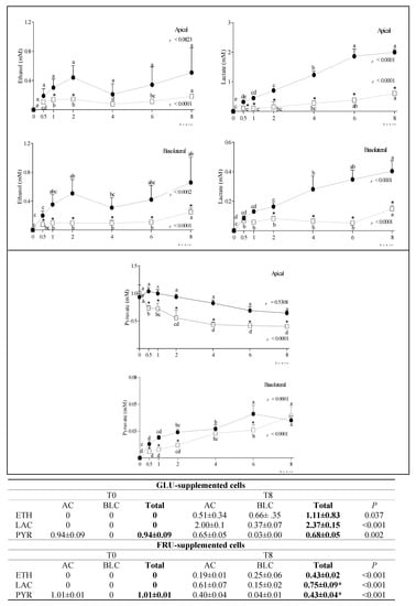 In SUC-supplemented cells, we detected very low amounts of GLU or FRU (<0.65 mM) either in the AC or BLC at any time after supplementation, indicating that the disaccharide was only minimally hydrolyzed. At longer incubation times, SUC slightly diffused from the AC to the BLC, probably via paracellular transport (Supplementary Figure S1). Since SUC-supplemented cells did not reproduce a physiological condition, we did not focus on this condition. Regardless of this, the obtained results in SUC-supplemented cells are provided as Supplementary Material (Supplementary Figures S1–S6). The time-course of changes in carbonyl metabolite (ethanol—ETH, lactate—LAC, pyruvate—PYR) concentration in the AC and BLC of GLU- and FRU-supplemented cells, and their total concentration (AC + BLC) at T0 and T8, is reported in Figure 2. Although ETH and LAC were not present in the supplemented media, their concentration significantly increased with time in both chambers, more evidently in GLU-supplemented cells. In these cells, PYR concentration in the AC was almost constant over time, while it significantly decreased in FRU supplemented cells. Notwithstanding, at T8, PYR concentration in the BLC was similar in both conditions. The total amount (AC + BLC) of PYR was significantly lower at T8 than T0, indicating its active metabolization particularly in FRU-supplemented cells.