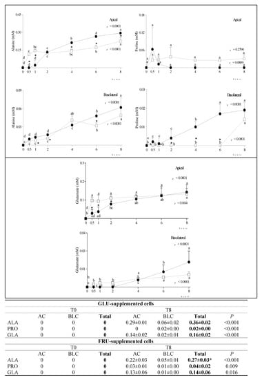 Changes in ALA, PRO and GLA concentration in the AC and BLC of GLU- and FRU-supplemented cells. Data are means ± SD of at least 3 samples from independent experiments. In graphs, amino acid concentration (mM) at different time points is indicated by black circles (GLU-supplemented cells) or white squares (FRU-supplemented cells). In each experimental condition, differences between different time points were evaluated by the one-way ANOVA with Tukey’s post hoc test (different letters indicate significant differences). At each time point, differences between GLU- and FRU-supplemented cells were evaluated by unpaired t-test (* at least p < 0.05). In the table, the total concentration of metabolites at T0 and T8 in the same experimental condition is reported and compared by an unpaired t-test. Statistical differences between the two experimental conditions in the metabolite total concentration at T8 were calculated by an unpaired t-test (* p at least < 0.05). GLU: glucose; FRU: fructose; AC: apical chamber; BLC: basolateral chamber; ALA: alanine; PRO: proline; GLA: glutamate.