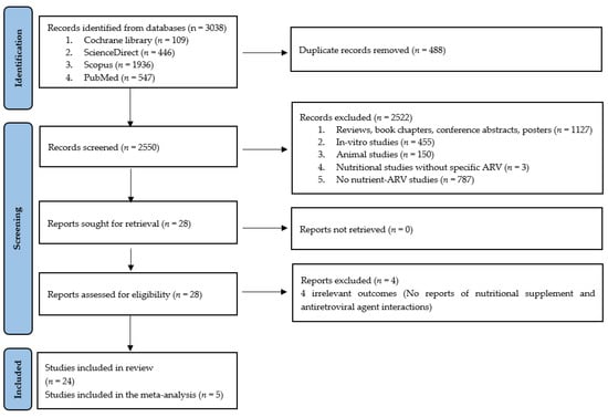 According to the Preferred Reporting Items for Systematic Reviews and Meta-Analyses (PRISMA) guidelines, a systematic literature search was conducted []. Four databases including Cochrane Library, ScienceDirect, Scopus, and PubMed were searched from the date of their inception to June 2021 to identify studies that explored supplements and ARV interactions. The search terms such as (food supplement OR dietary supplement OR nutrient supplement) AND (antiretroviral therapy OR antiretroviral drug OR non-nucleoside reverse transcriptase inhibitor OR nucleoside reverse transcriptase inhibitor OR protease inhibitor) AND (area under curve OR cytochrome P450 OR plasma concentration) were used. No filters or restrictions were applied during the search. The full search strategies are mentioned in Supplementary Material Table S1. The full protocol of this systematic review and meta-analysis was not registered.