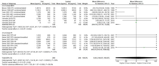 This systematic review and meta-analysis mainly presented no significant pharmacokinetic changes in AUC, C24, and t1/2 of ARV when co-administered with food or dietary supplements. However, it can be highlighted that there was an increase in tmax of NRTI and PI under fed conditions. Of interest, the higher Cmax in fed state was observed in participants receiving the PI regimen in this study. Among the articles included in this systematic review, most of the ARV’s pharmacokinetic parameters were not clinically altered by the concurrent administration of food and other supplements such as quercetin, Ginkgo extract, vitamin supplement, Ginseng, or β-carotene.