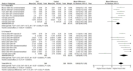 The results of the subgroup meta-analysis of pharmacokinetic changes in tmax of ARV depending upon food or supplement administration are shown in Figure 5. The overall effect in NRTI group indicates a significantly higher tmax value under fed condition (mean difference 0.67, 95% CI 0.44-0.91, p < 0.00001), showing the heterogeneity of 63%. Similarly, we found a significant increase in tmax in fed state compared to fasted condition in PI receiving groups (mean difference 1.29, 95% CI 0.81-1.77, p < 0.00001) (Figure 5). For both NRTI and PI groups, none of these show any clinically significant changes in t1/2 (Figure 6). We observed no statistical heterogeneity on t1/2 of both NRTI and PI regimens.