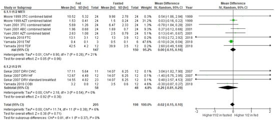 Figure 2 shows the meta-analysis of the pharmacokinetic effects of food on the AUCinf of ARV. There were no significant changes in AUCinf of ARV between fasted and fed conditions (mean difference -24.64, 95% CI -141.34to 92.07, p = 0.68), with a substantial heterogeneity of 75%.