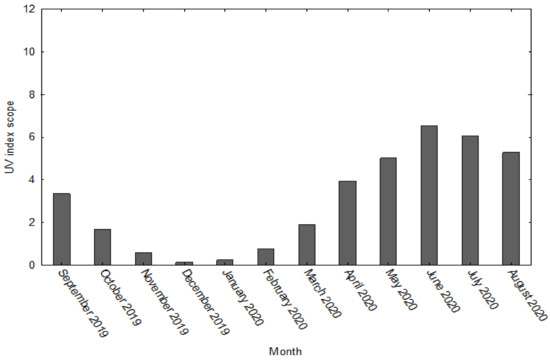 The research was conducted in Poland (Gdynia, 54.50° N 18.55° E, 33 m above sea level) in the northern part of Europe. The degree of UV radiation during the project duration, i.e., between September 2019 and August 2020, was recorded on the basis of historical data from the weather online service for the city of Gdynia [39] (Figure 2).