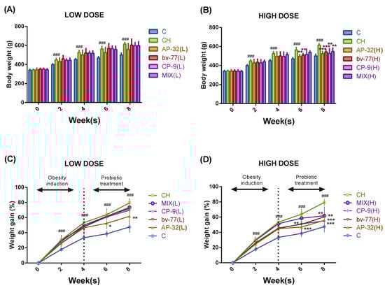 At week 0, the body weights of all the rats were similar before the induction of the high-fat diet (HFD), and the HFD treatment induced the symptom of obesity in 2 weeks. Both body weight and weight gain increased significantly (### p < 0.001) in the symptom control group (CH) compared to the blank control group (C) from week two to week eight (Figure 1). Obesity was induced before probiotic interventions from week one to week four, and probiotic strains were provided together with the HFD from week five to week eight. At week six, the body weight was 469.40 ± 13.90 g in the C group and 562.12 ± 28.14 g in the CH group. At week eight, the body weight was 499.40 ± 20.90 g in the C group and 614.92 ± 14.71 g in the CH group. Compared to the CH group at week six, body weights were significantly (** p < 0.01) lower in the AP-32(H) and bv-77(H) groups, and were significantly (** p < 0.01, *** p < 0.001) lower in the AP-32(H), bv-77(H), CP-9(H), and MIX(H) groups at week eight (Figure 1A,B). At week six the weight gain rate was 38.55 ± 4.33% in the C group and 63.85 ± 6.68% in the CH group. At week eight the weight gain rate was 47.45 ± 7.42% in the C group and 79.30 ± 4.46% in the CH group. Compared to the CH group at week six, the weight gain rates were significantly (* p < 0.05, ** p < 0.01, and *** p < 0.001) lower in the AP-32(L), AP-32(H), and bv-77(H) groups, and were significantly (** p < 0.01, *** p < 0.001) lower in the AP-32(L), AP-32(H), bv-77(H), CP-9(H), and MIX(H) groups at week eight (Figure 1C,D).