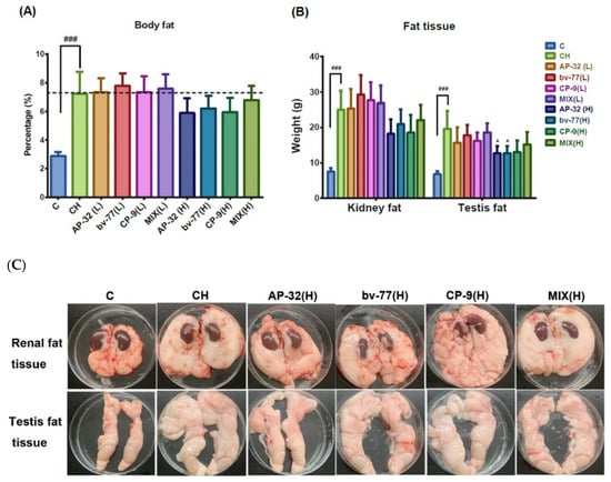 Rats were euthanized at the end of the experiment at week eight, and the effects of the probiotic treatments on body fat formation were evaluated by visual examinations and measurements of body fat and tissue fat (Figure 3). Percentages of body fat were 2.88 ± 0.28% in the C group and 7.24 ± 1.52% in the CH group. The content of body fat was significantly higher (### p < 0.005) in the CH group compared to the C group. High-dose supplements of probiotics showed a mild reduction in body fat increment; however, the effect was not significant compared to the CH group (Figure 3A). Fat tissues were collected from the area around the kidney and testes. The weights of the kidney fat were 7.54 ± 1.05 g in the C group and 24.96 ± 5.49 g in the CH group. The weights of the testis fat were 6.82 ± 0.80 g in the C group and 19.58 ± 5.10 g in the CH group. The net tissue weights of both areas were significantly higher (### p < 0.005) in the CH group compared to the C group (Figure 3B). The weights of kidney fats showed a mild, but not significant, reduction in groups supplied with a high dose of probiotics. The weights of the testis fats showed significant (* p < 0.05) decreases in the AP-32(H) and bv-77(H) groups compared to the CH group, while CH-9(H) and MIX(H) showed mild, but not significant, reductions (Figure 3B).