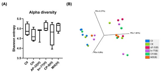 Fecal samples were collected after probiotic treatments and all fecal specimens were extracted using a Qiagen DNA kit (Hilden, Germany) according to the manufacturer’s instructions. DNA samples with optical density (OD) 260/280 in the range of 1.8~2.0. Using metagenomic DNA as a template, 16S rDNA PCR was amplified with the bacterial-specific primers 314F (5′-TCG TCG GCA GCG TCA GAT GTG TAT AAG AGA CAG CCT ACG GGN GGC WGC AG-3′) and 805R (5′-GTC TCG TGG GCT CGG AGA TGT GTA TAA GAG ACA GGA CTA CHV GGG TAT CTA ATC C-3′). The amplified DNA sizing was checked by TapeStation (Agilent Technologies, Santa Clara, CA, USA). Sequencing was carried out by the Illumina Miseq platform. Indices and Illumina sequencing adapters were attached to DNA samples using a Nextera XT Index Kit (Juno Beach, FL, USA). After library construction, samples were mixed with MiSeq Reagent Kit v3 (600-cycle, Illumina, San Diego, CA, USA) and loaded onto a Miseq cartridge, then onto the instrument. Automated cluster generation and a 2 × 300 bp paired-end sequencing run was performed. The sequences generated went through a filtering process to obtain the qualified reads. Total reads were merged after removing low-quality sequences and chimeric sequences, and clustered to operational taxonomic unit (OTU)-at 97% similarity with the Greengenes database (v13.8). All OTU sequences and diversity analysis were obtained using a CLC Microbial Genomics Module (v10.0, Qiagen, Germany), BaseSpace (Illumina, San Diego, CA, USA), and GraphPad Prism 8 (GraphPad Software, San Diego, CA, USA). A p-value less than 0.05 is considered statistically significant.