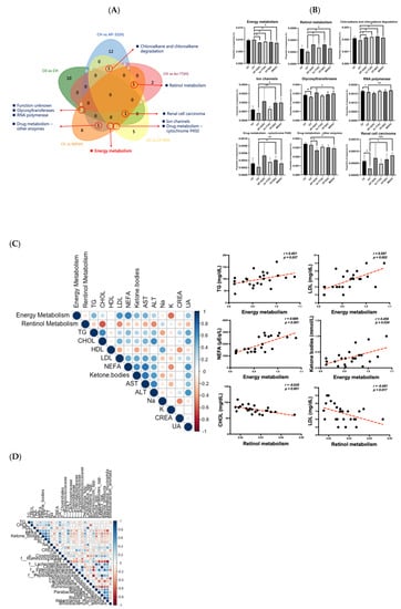 A PICRUSt (Phylogenetic Investigation of Communities by Reconstruction of Unobserved States) analysis was used to figure out which metabolic/signaling pathways might be involved in the impacts of these probiotic interventions (Figure S6A–E). It is noted that gut microbiota had been mentioned as one of the confounding factors responsible for the control of body weight and energy metabolism, with a connection to obesity [24]. A total of 45 functional pathways were modulated by probiotic treatments alone or in combination as compared to the HFD control (CH, Figure 6A). The Venn diagrams illustrated the numbers of shared functional pathways across each group. The across pathway of the AP-32, CP-9, and MIX groups was energy metabolism. The across pathway of the bv-77, CP-9, and MIX groups was retinal metabolism. The across pathway of the C0, CP-9, and MIX groups was renal cell carcinoma. The across pathways of the AP-32, CP-9, and bv-77 treatment were chloroalkane and chloroalkene degradation. The across pathways of the C0 and MIX groups were the function unknown, glycosyltransferases, and RNA polymerase. Across AP-32 and MIX groups were found: drug metabolism—other enzymes. The across pathways of the CP-9 and MIX groups were the ion channel and drug metabolism—cytochrome P450 (Figure 6A,B). In the Venn plots, energy metabolism dramatically decreased in all treated groups as compared to the HFD control (Figure 6A,B). Previous reports have also revealed that retinol metabolism participates in the regulation of obesity [25,26]. Retinol metabolism increased in the bv-77, CP-9, and MIX groups (Figure 6B). Eight pathways increased upon the combined treatment with three probiotic strains, except energy metabolism, as compared with the CH group (Figure 6B). Energy and retinol metabolisms, in addition to seven other pathways, were further analyzed in regard to their potential link to obesity. Notably, the unknown pathway function was not shown here. Spearman’s correlation analysis was used to analyze the correlation between these two signaling pathways and serum lipid profiles (Figure 6C). Energy metabolism was positively correlated with serum levels of TG, LDL, NEFA, and ketone bodies. Retinal metabolism was negatively correlated with serum CHOL and LDL levels (Figure 6C). These results suggested that probiotic strains might decrease serum levels of certain lipid-related characteristics through negatively regulating energy metabolism but positively regulating retinol metabolism. Furthermore, serum TG levels were positively correlated with Oscillospira and f__S24-7. LDL levels were positively correlated with Oscillospira and f__S24-7, but negatively correlated with Blautia producta, A. muciniphila, f__Enterobacteriaceae, and f__Lachnospiraceae. CHOL levels were negatively correlated with Burkholderia spp. HDL levels were positively correlated with Lactobacillus spp. Ketone bodies were positively correlated with Oscillospira, but negatively correlated with SMB53 and Blautia spp. NEFA levels were positively correlated with Oscillospira, f__S24-7, and Ruminococcus, but negatively correlated with A. muciniphila, Blautia producta, SMB53, f__Clostridiaceae, and f__Peptostreptococcaceae (Figure 6D). These results showed the link of the abundance of core bacteria of the gut to blood lipid profiles, suggesting that alterations in the microbial abundance might contribute to metabolic outcomes. Accordingly, we found that energy metabolism was positively correlated with Oscillospira, Ruminococcus, and f__S24-7, but negatively correlated with Blautia producta, A. muciniphila, Parabacteroides, SMB53, and f__Lachnospiraceae (Figure 6E). The results presented the correlation of the abundance of single-core bacteria of the gut with metabolic function pathways, indicating that alterations in the abundance of the gut bacteria mediated by probiotic treatments might change metabolic ability.