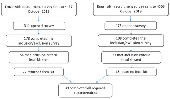 A schematic for recruiting participants is shown in Figure 1. Participants were excluded if they met at least one of the following criteria: (1) took an antibiotic in the last three months, (2) consumed an anti-diarrhea medicine in the last week, (3) took a laxative in the last week, (4) consumed prebiotics in the last week, (5) consumed probiotics in the last week, (6) were diagnosed with cancer, (7) have Crohn’s disease, (8) were taking prescription drugs other than oral contraceptives, (9) were cutting for an upcoming competition or tournament, (10) were under 25 years of age, or (11) lived outside the contiguous United States. We asked potential participants to share their maximum squat, bench press, or deadlift and then calculated a weight-lifted-to-body-mass ratio. Those who could not lift at least half of their body weight were excluded. Each participant was asked if they used protein supplements so they could be assigned to one of two groups: protein supplement (PS) and no protein supplement (No PS). The participants that met the criteria were sent an email welcoming them to the study and requested verification that they were willing to participate. If their response was positive, they were sent a fecal collection kit. After collecting their fecal sample, the participant completed a supplement questionnaire; a workout questionnaire; an online version of the International Physical Activity Questions (IPAQ); and a 24-h food recall, using the self-administered 24-h dietary assessment tool (ASA24). Each participant completed the study at his or her physical location anywhere in the contiguous United States. Participants were recruited in two cohorts one year apart at the same time of year (October/November/December). For successful participation in the study, the participant had to (1) complete a signed written informed consent, (2) complete a signed HIPAA consent, (3) acknowledge that they were training to build muscle, (4) complete the required questionnaires, and (5) return the fecal sample. Thirty-nine participants provided a fecal sample and completed all the required forms.