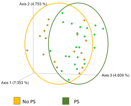 Bacterial diversity was measured within a sample (alpha) and between samples (beta). We used Chao, Shannon, Faith PD, and Simpson to measure alpha diversity. These indexes consider the number of unique operational taxonomic units (OTUs), richness, the relative abundance of OTUs, and evenness. All four measures found that the No PS and PS groups had similar alpha diversity. Bray–Curtis, Jaccard, and UniFrac were used to measure beta diversity. Only Jaccard similarity (ANOSIM) was significantly different (p = 0.035). As shown in Figure 2, the two groups overlapped with a modest difference in community separation between the two groups.