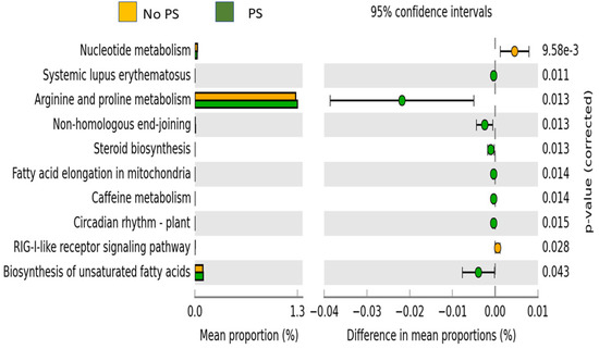 The predicted functional pathways that were significantly different are shown in Figure 3. Ten pathways emerged as significantly different between the No PS and PS groups. Eight of the ten pathways (arginine and proline metabolism, biosynthesis of unsaturated fatty acids, caffeine metabolism, circadian rhythm-plant, fatty acid elongation in mitochondria, non-homologous end-joining, steroid biosynthesis, and systemic lupus erythematosus) were more highly expressed in the PS group. The nucleotide metabolism and RIG-1-like receptor signaling pathway were more highly expressed in the No PS samples.