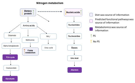 Finally, nitrogen metabolism can be altered by protein consumption. A high-protein diet contains a large quantity of purine, a nucleotide. Uric acid is produced when purines are enzymatically degraded [44]. Uric acid is then further degraded to allantoin, the metabolite with the highest VIP score. The PS group had a significantly higher allantoin relative abundance in their feces compared to the No PS group. Since allantoin and uric acid, along with other metabolites involved in purine metabolism, are driving the separation between the PS and No PS groups, it can be concluded that higher levels of dietary protein favor purine degradation. This evidence is further supported by a greater relative abundance of f. Lactobacillales in the PS group (p = 0.007), a bacteria family that functions in purine absorption and uric acid decomposition [45]. Additionally, genes encoding for nucleotide metabolism were significantly more abundant in the No PS group. This observation could be expected, because the No PS group had a lower protein intake, which leads to fewer purines, creating a greater need for genes involved in purine metabolism.