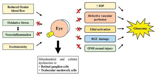 Schematic diagram showing how oxidative stress, neuroinflammation, reduced ocular blood flow and excitotoxicity lead to subsequent pathological changes observed in glaucoma. The therapeutic potential of natural products against glaucomatous changes at various steps is shown with the symbol ×. RGC, retinal ganglion cell; IOP, intraocular pressure; ONH, optic nerve head.