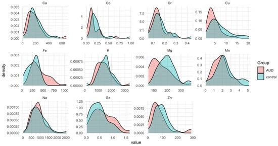 Based on the results of ICP-OES analyses, descriptive statistics parameters were calculated, such as average concentrations of individual metals expressed in µg/g wet weight, their range, median, standard deviation (SD), and standard error (SE). Descriptive statistics for the group of cases and controls are collected in Table 3 (Table 3). Based on the presented summary, it can be seen that the highest levels concern micronutrients from the group of macroelements such as sodium (Na), potassium (K), magnesium (Mg), calcium (Ca), and iron (Fe) in the liver tissue in both the AUD and control groups. For these elements, the highest SD values can be noticed, which indicates high individual variability in the level of macronutrients in the liver tissue. Next in terms of content are zinc (Zn) and copper (Cu). The next series deals with manganese (Mn) and selenium (Se). The lowest levels were noted for cobalt (Co) and chromium (Cr). From the median values, the following series can be constructed (in descending order) for the AUD group: K, Na, Fe, Ca, Mg, Zn, Fe, Cu, Mn, Se, Cr, Co; and for controls: K, Na, Fe, Ca, Mg, Zn, Fe, Cu, Mn, Se, Co, Cr. The distribution density of the experimental data (value) obtained for individual elements in both studied groups is presented in the graphs in Figure 1. As can be noticed the distribution was characterized by strong asymmetry in most cases.